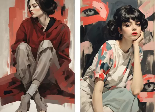 Plakat Tüdrukute portreed punases ja beežis abstraktses stiilis d00695