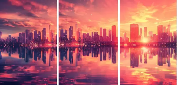 Plakat Romantiline päikeseloojang modernse linna taustal d00784