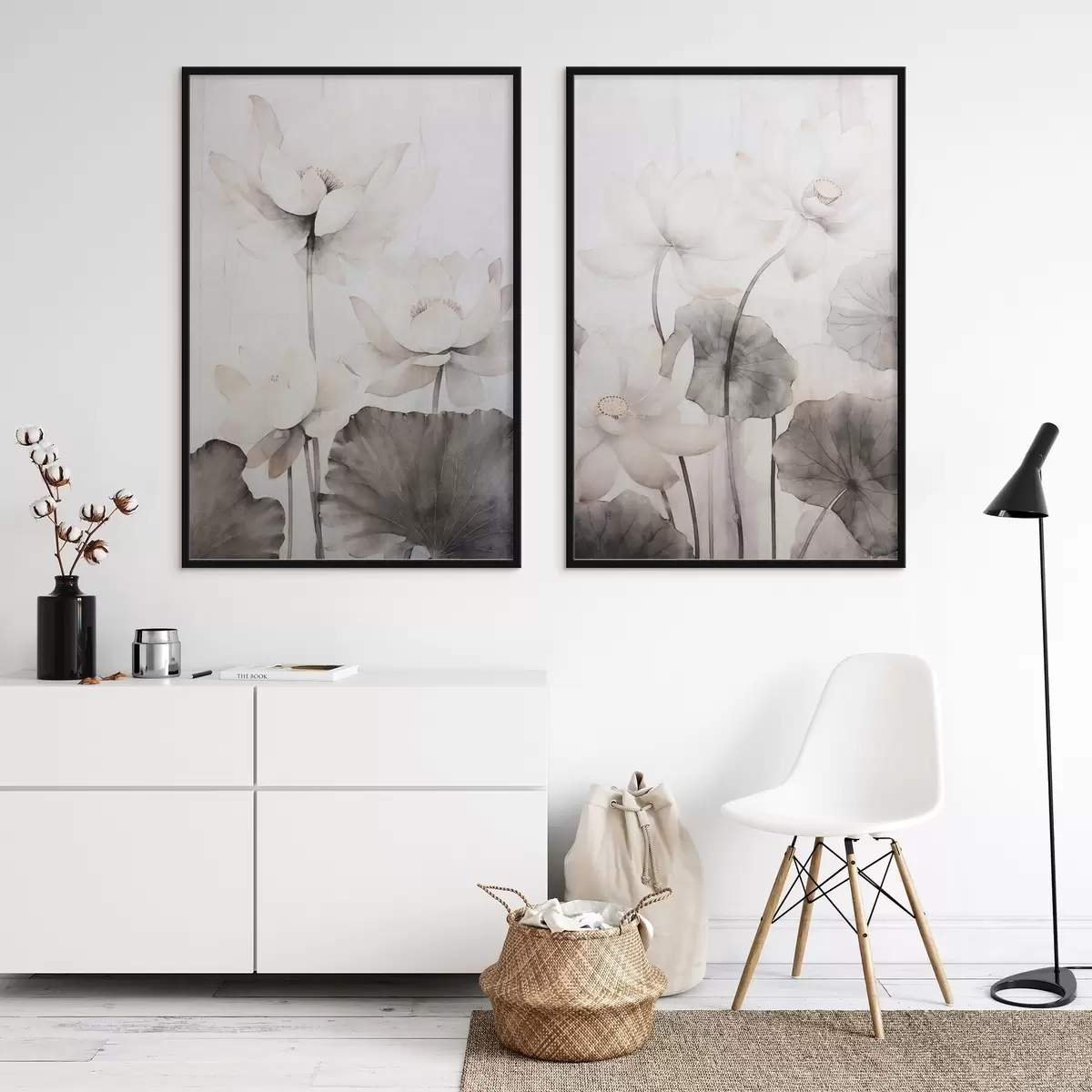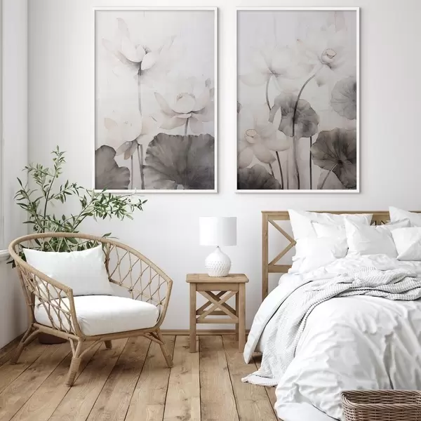Plakat Valged tekstuuriga lootoseõied tumedate lehtedega, hele taust, minimalistlik disain d00824
