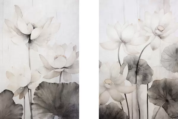 Plakat Valged tekstuuriga lootoseõied tumedate lehtedega, hele taust, minimalistlik disain d00824