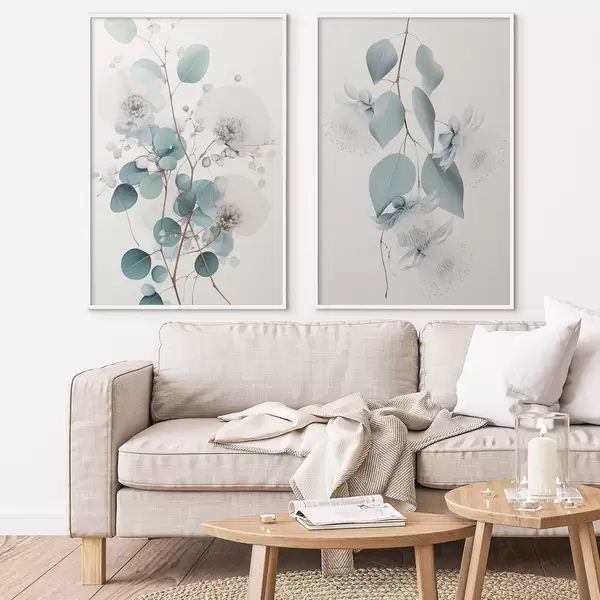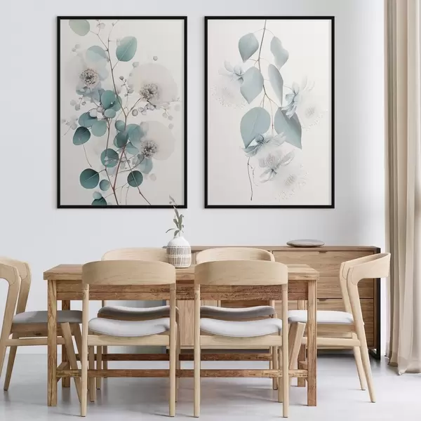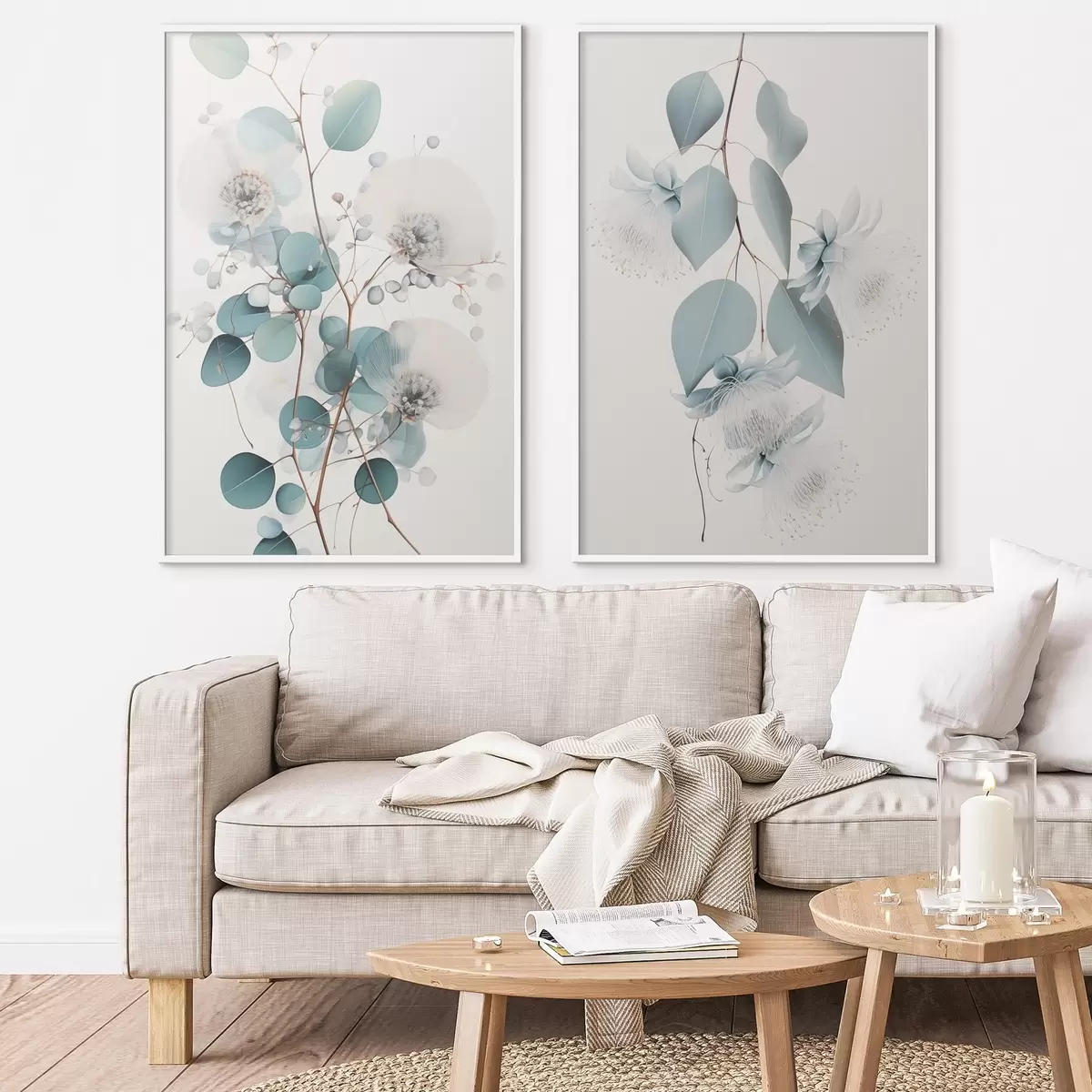 Poster Eukalüptuse oks siniste lehtede ja valget värvi õitega, hele taust Nr d00829
