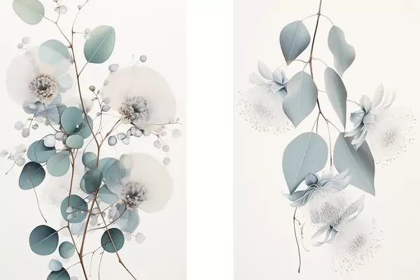 Poster Eukalüptuse oks siniste lehtede ja valget värvi õitega, hele taust Nr d00829