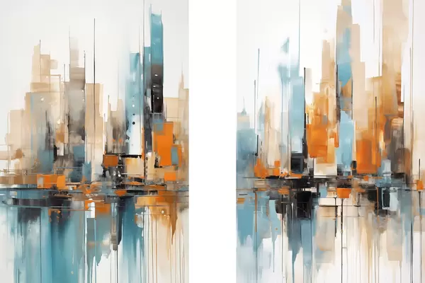 Plakat Abstraktne linnamaastik oranži, sinise ja valge toonides vertikaalsete pintslitõmmetega, maalistiil d00876