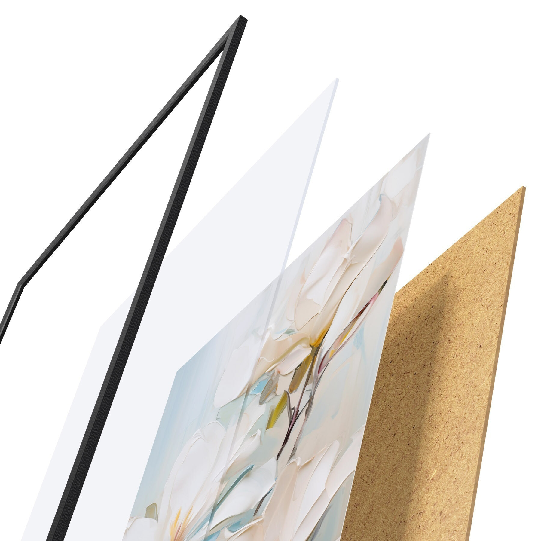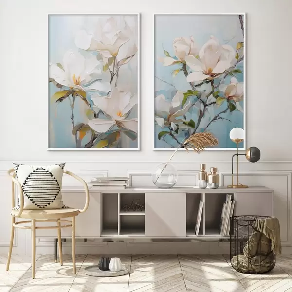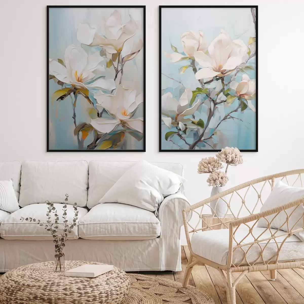 Poster Valged magnoliaõied, helesinine taust pehme pintslitõmbega, õlimaalistiilis, impasto tekstuuriga Nr d00881