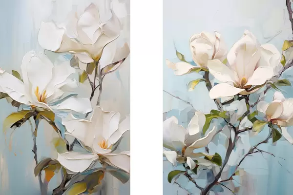 Poster Valged magnoliaõied, helesinine taust pehme pintslitõmbega, õlimaalistiilis, impasto tekstuuriga Nr d00881