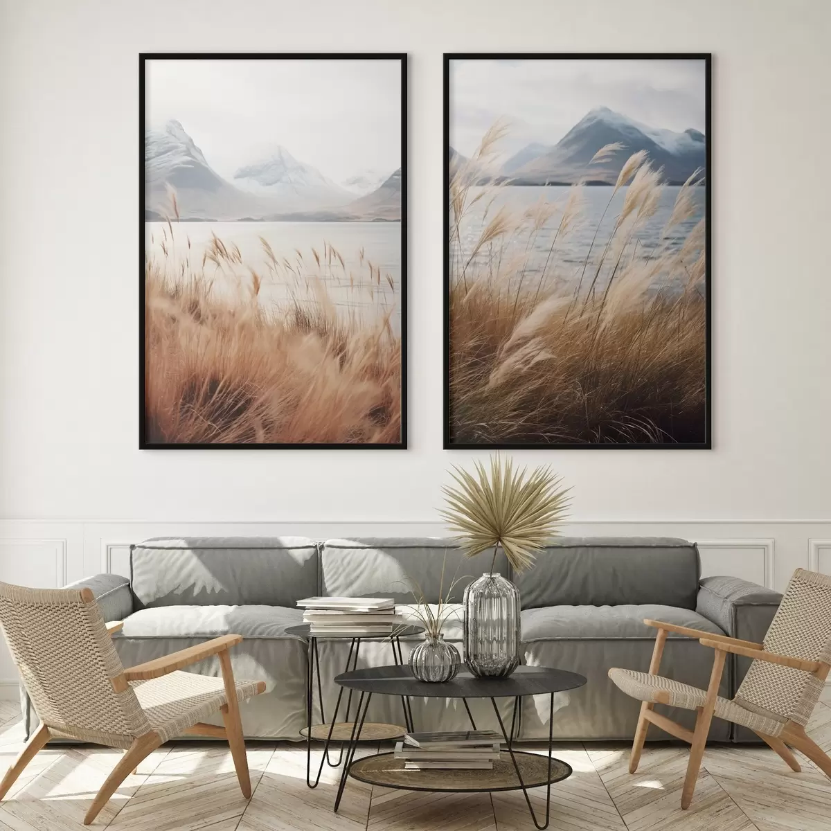 Poster Pampasrohi järve ja mägede taustal, pehme valgustus, summutatud värvid, naturalistlik stiil Nr d00884