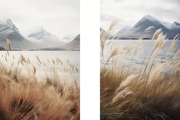 Poster Pampasrohi järve ja mägede taustal, pehme valgustus, summutatud värvid, naturalistlik stiil Nr d00884