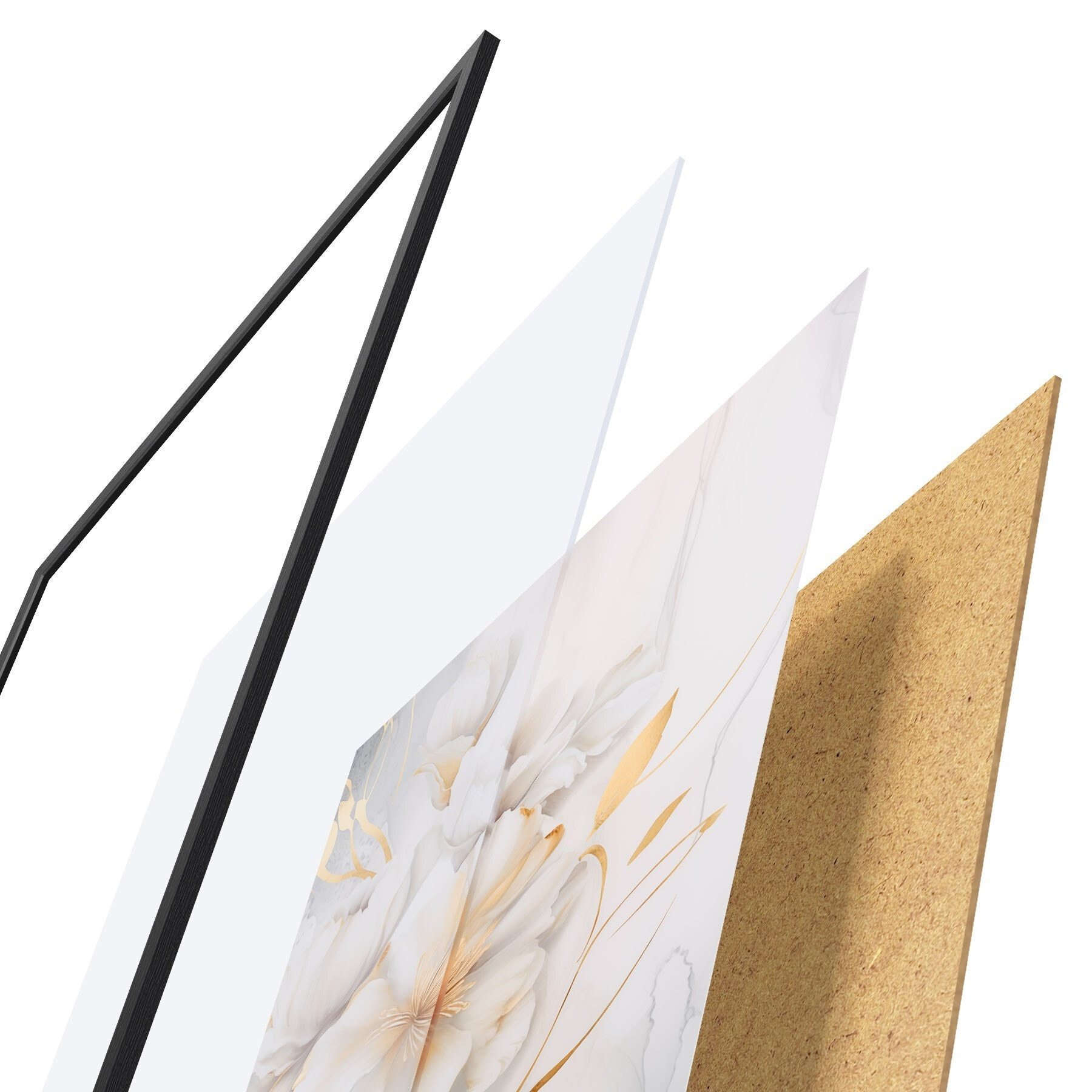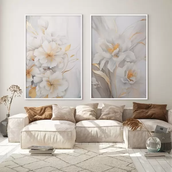 Plakat Valged lilled kollaste detailidega, õielehed peene varjundiga, hele taust peene marmoriefektiga d00889