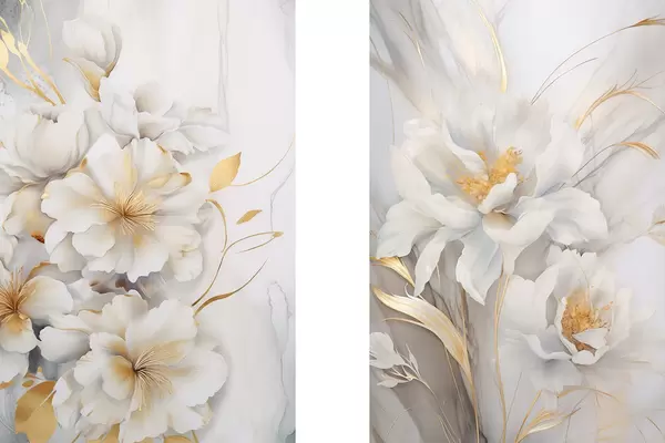 Poster Valged lilled kollaste detailidega, õielehed peene varjundiga, hele taust peene marmoriefektiga Nr d00889