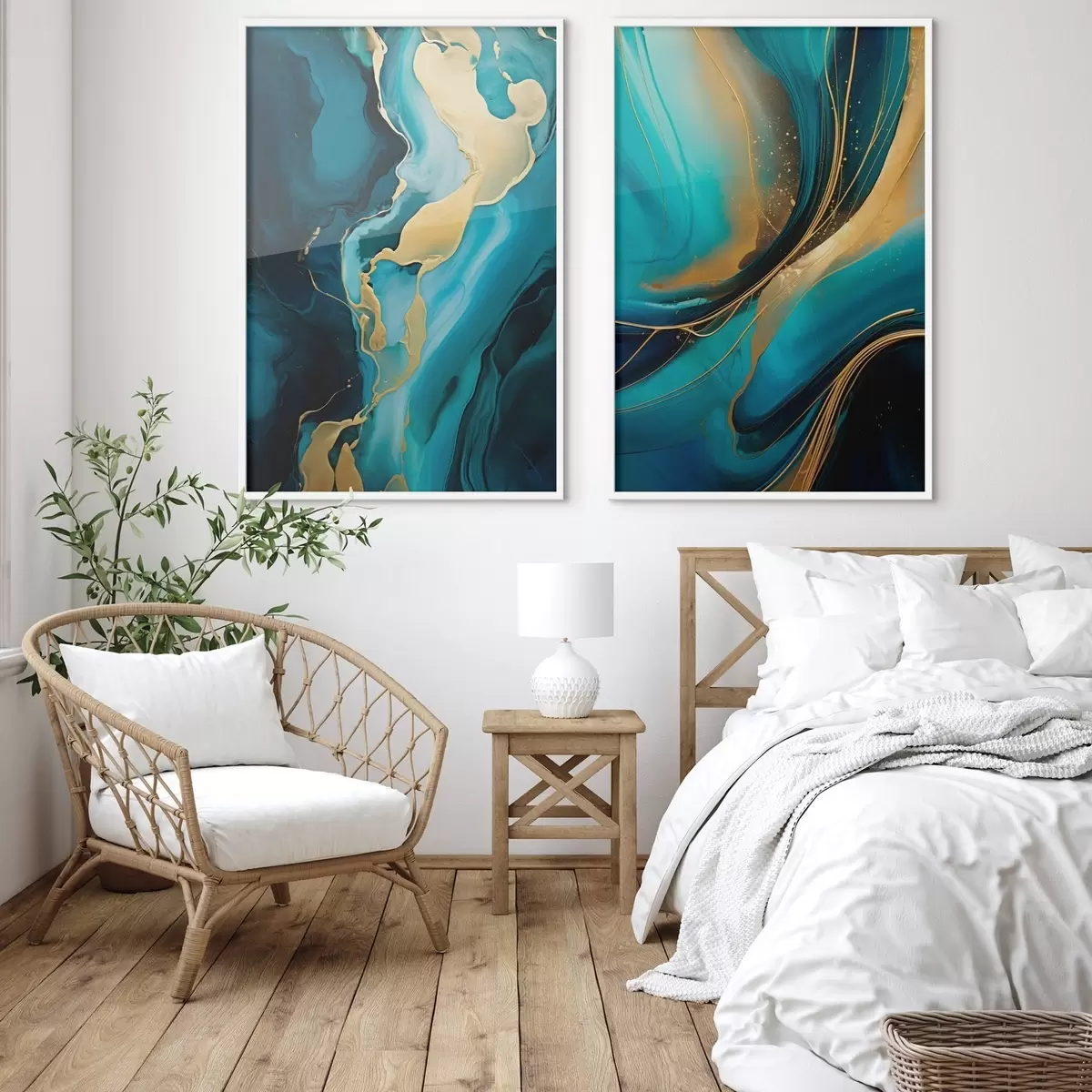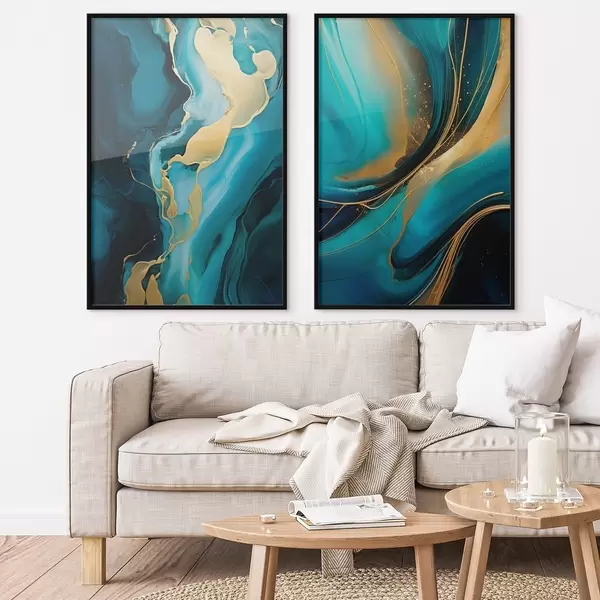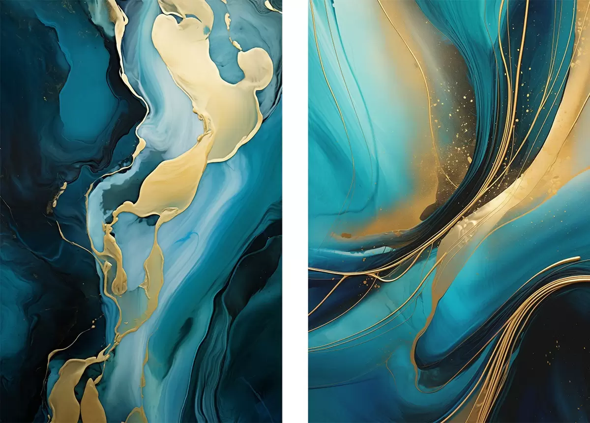 Poster Teal-värvi vedel abstraktne kujundus soojade metalliliste voogudega Nr d00965