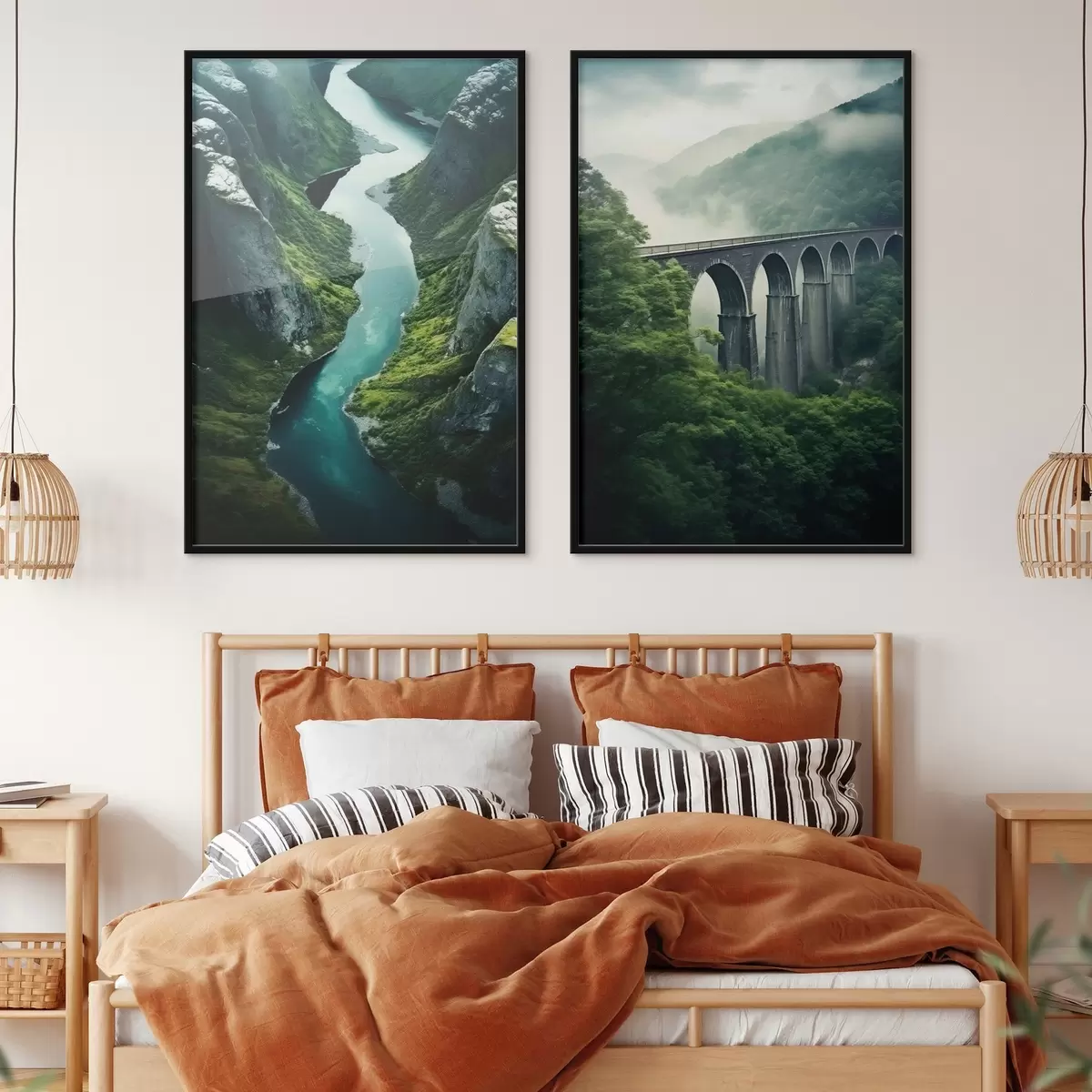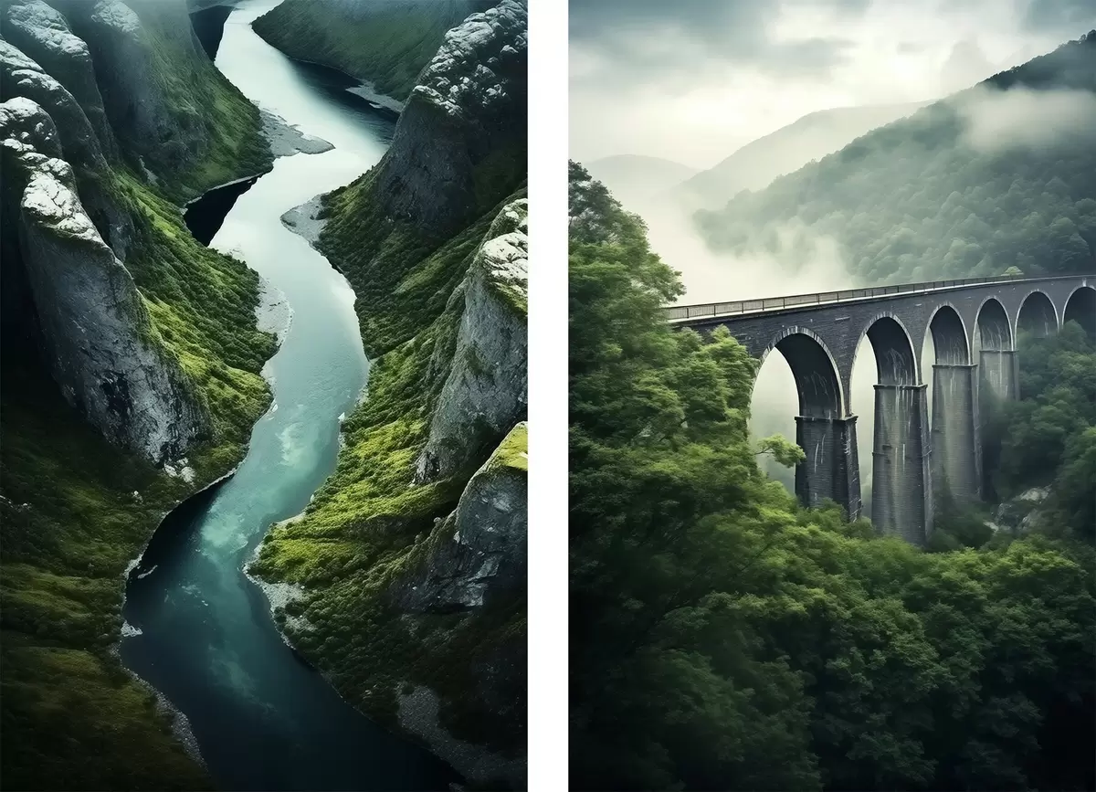 Poster Õhust vaadatav jõe kanjon ja udune viadukt rohelistel mägedel Nr d00967
