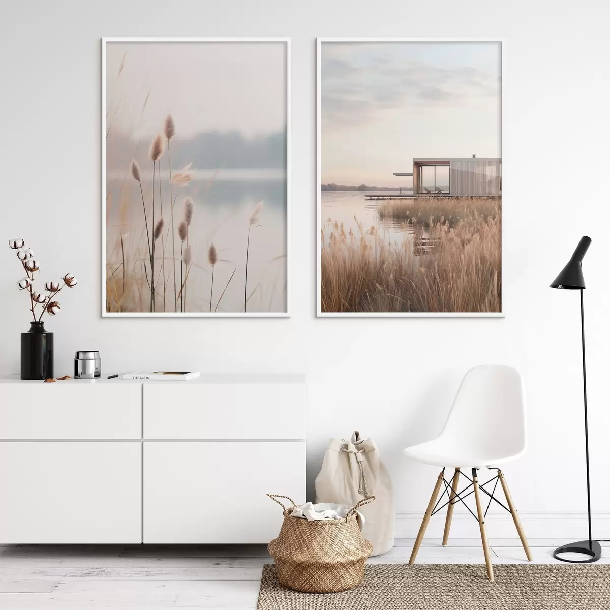 Poster Pehmed pilliroogud rahuliku järve ääres ja kaasaegne majake kaldal Nr d00970