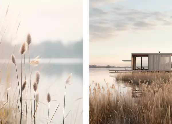 Poster Pehmed pilliroogud rahuliku järve ääres ja kaasaegne majake kaldal Nr d00970