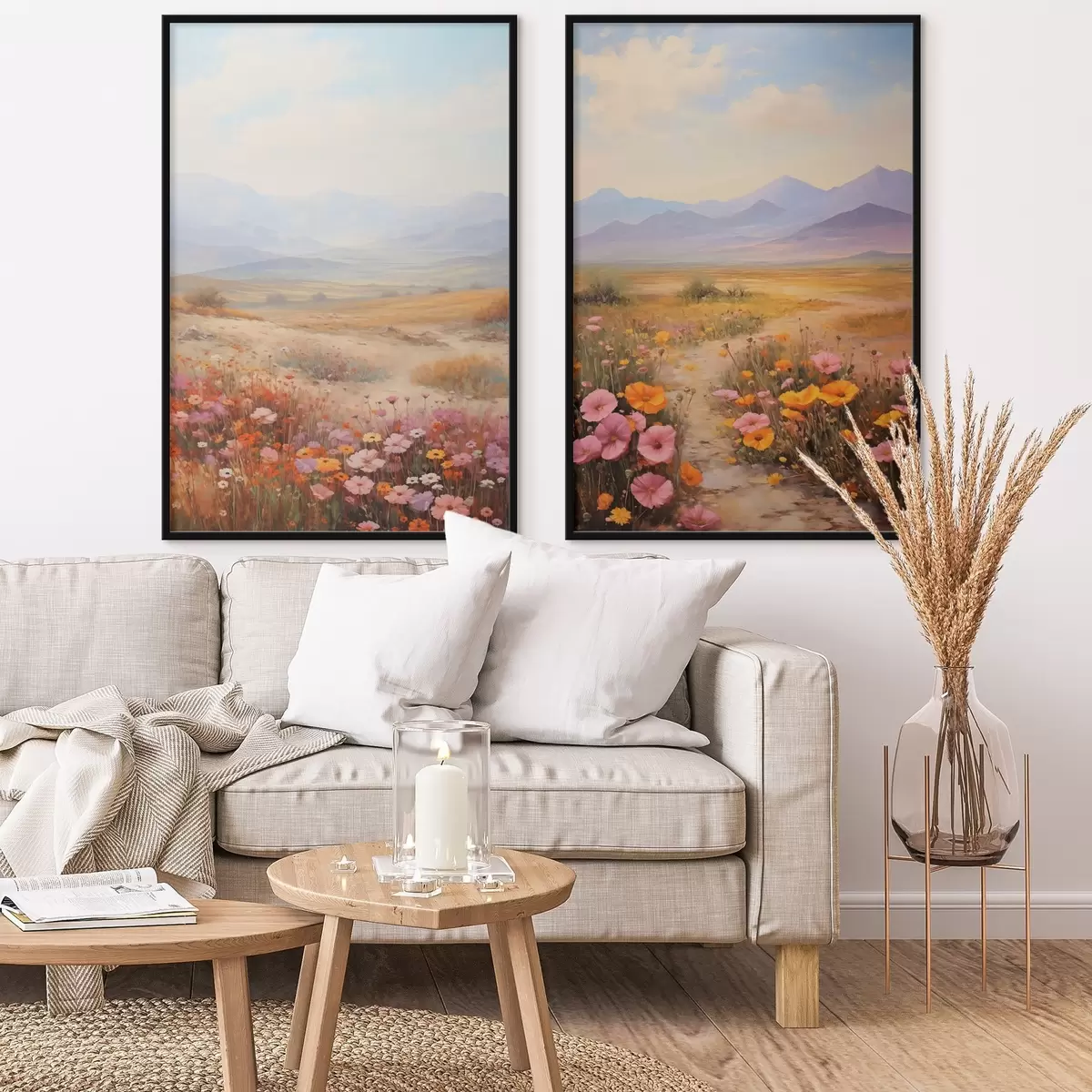 Plakat Maastik, värviliste lillede väli mägedega taustal, pehmed ja pastelsed värvid d01003