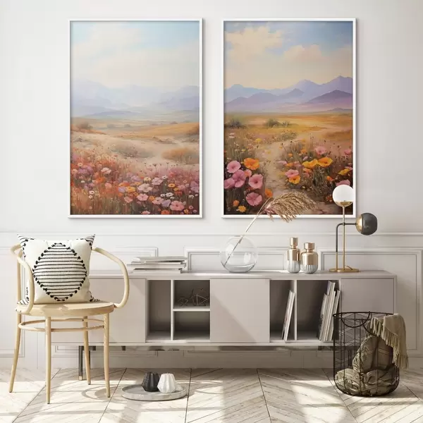 Poster Maastik, värviliste lillede väli mägedega taustal, pehmed ja pastelsed värvid Nr d01003