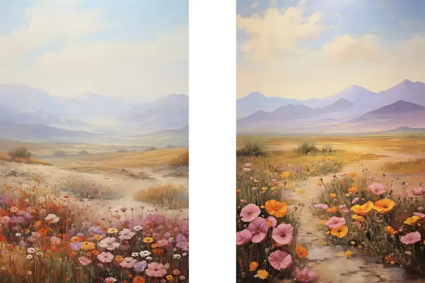 Poster Maastik, värviliste lillede väli mägedega taustal, pehmed ja pastelsed värvid Nr d01003