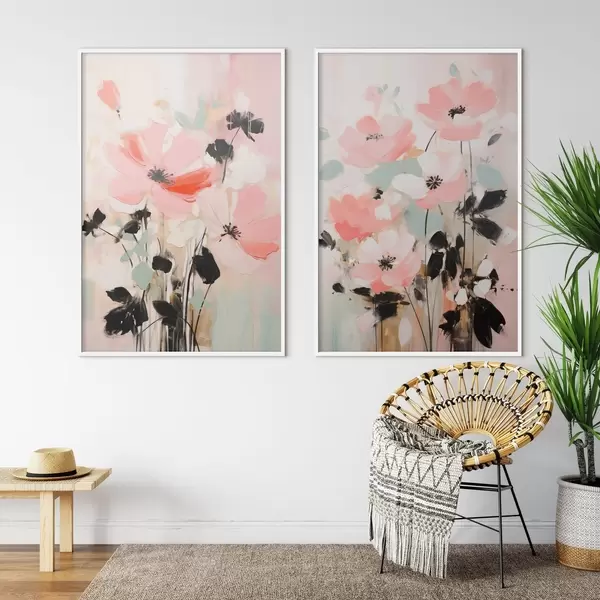Plakat Roosad ja mustad lilled lehtedega, pehmed pastelltoonid, abstraktne lillekompositsioon, minimalistlik kunst d01004