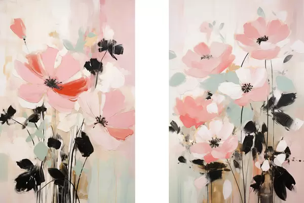 Plakat Roosad ja mustad lilled lehtedega, pehmed pastelltoonid, abstraktne lillekompositsioon, minimalistlik kunst d01004