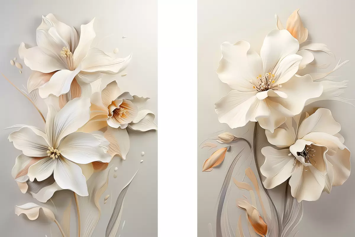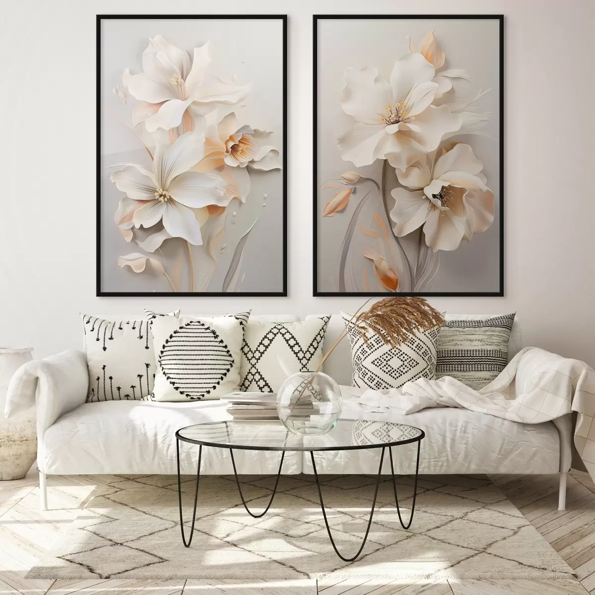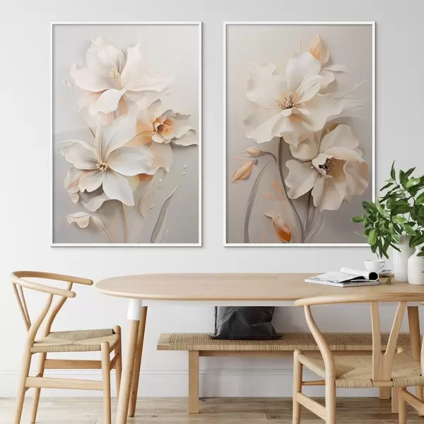 Plakat Valged lilled, õrnade varjudega kroonlehed, helebeež taust, elegantne kompositsioon, minimalistlik stiil d01010