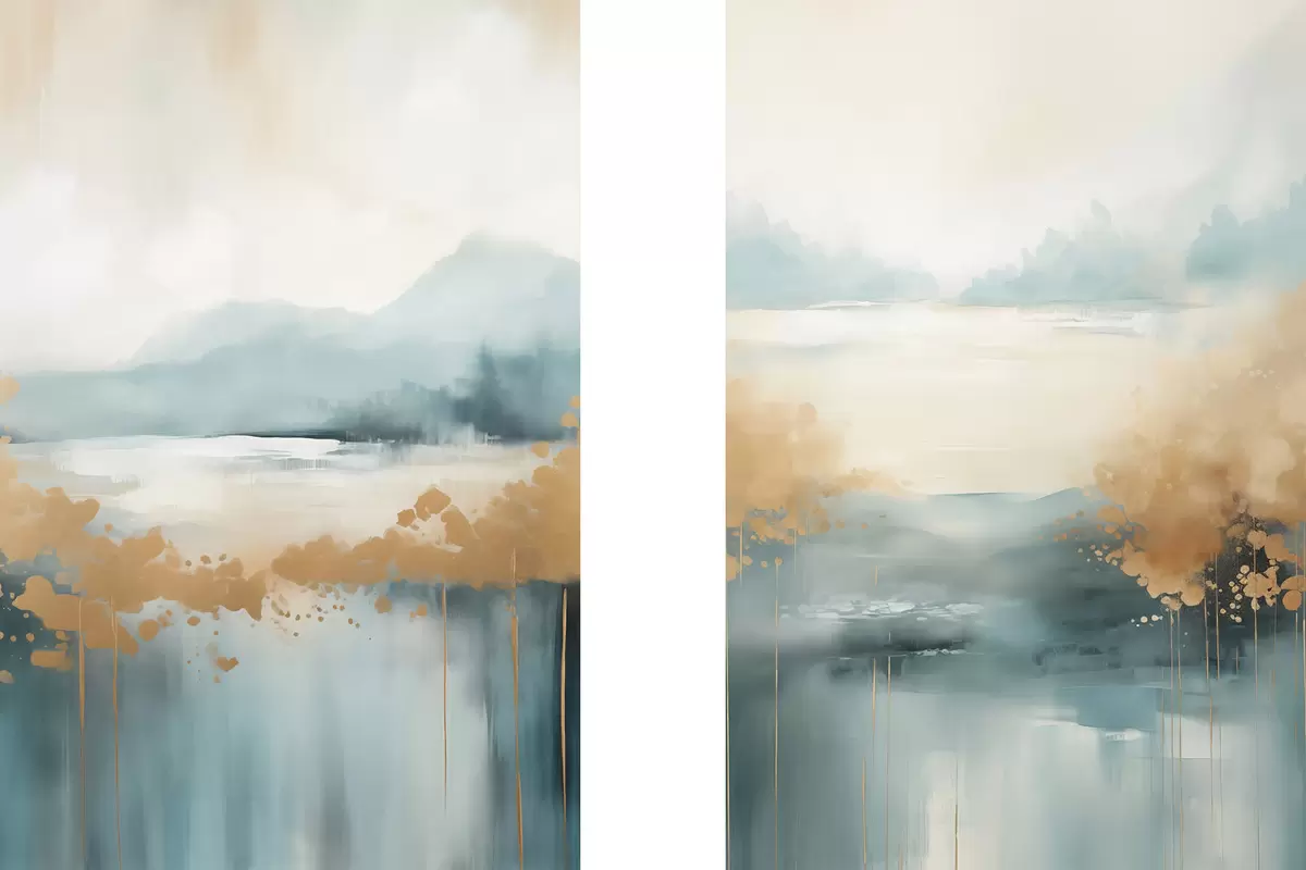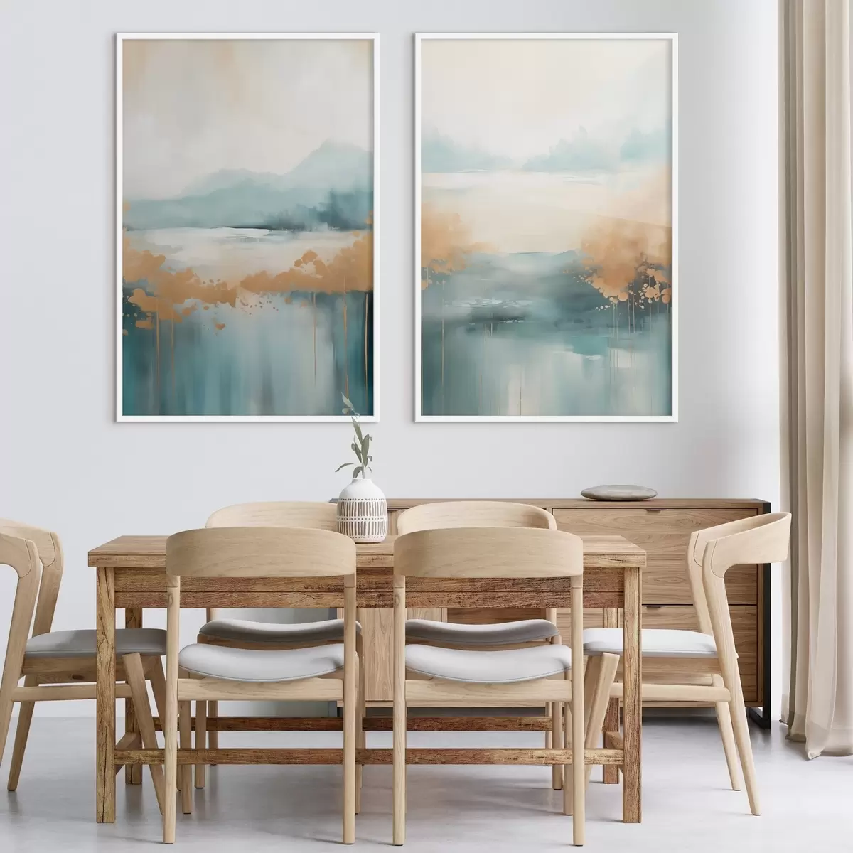 Poster Abstraktne maastik mägedega ja järvega sinakasrohelises ja tekstuurse kollases toonis, pehmed pintslitõmbed, minimalistlik kunstiteos Nr d01012