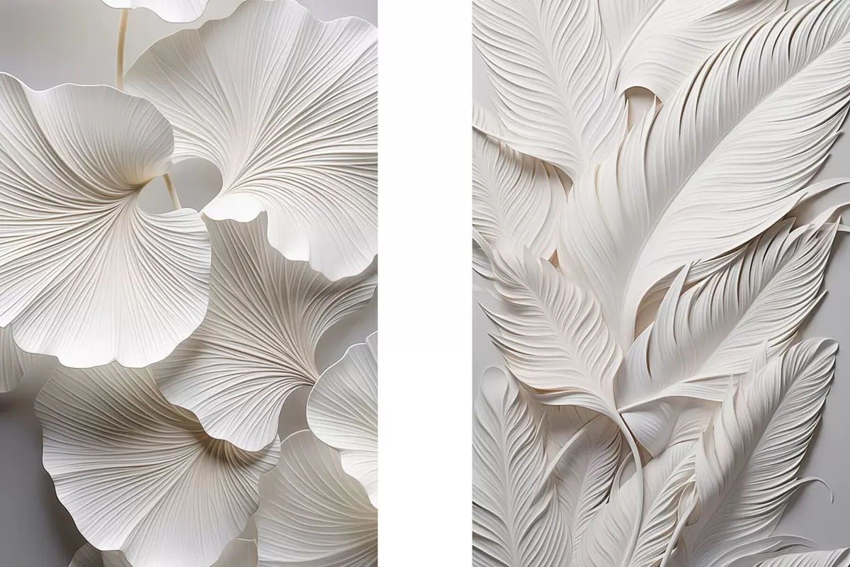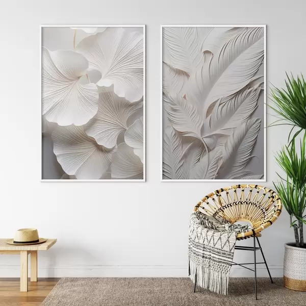 Poster Valged hõlmikpuu lehed ja pikad lehed keeruliste detailidega, mis loovad tekstuurse ja kihilise efekti, minimalistlik kunst Nr d01013