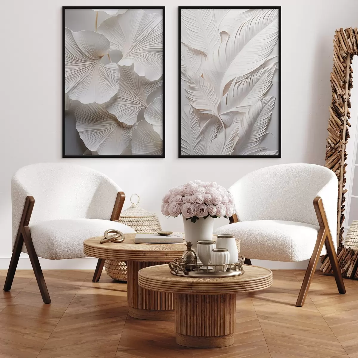Plakat Valged hõlmikpuu lehed ja pikad lehed keeruliste detailidega, mis loovad tekstuurse ja kihilise efekti, minimalistlik kunst d01013