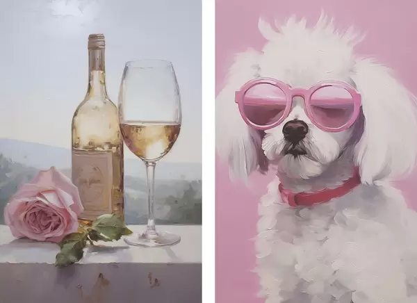 Poster Pudel ja klaas veini ning prillidega puudel, imitatsioonmaal Nr d01021