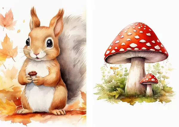 Poster Orav ja metsa seened, kärbseseen, imitatsioon akvarell Nr d01049