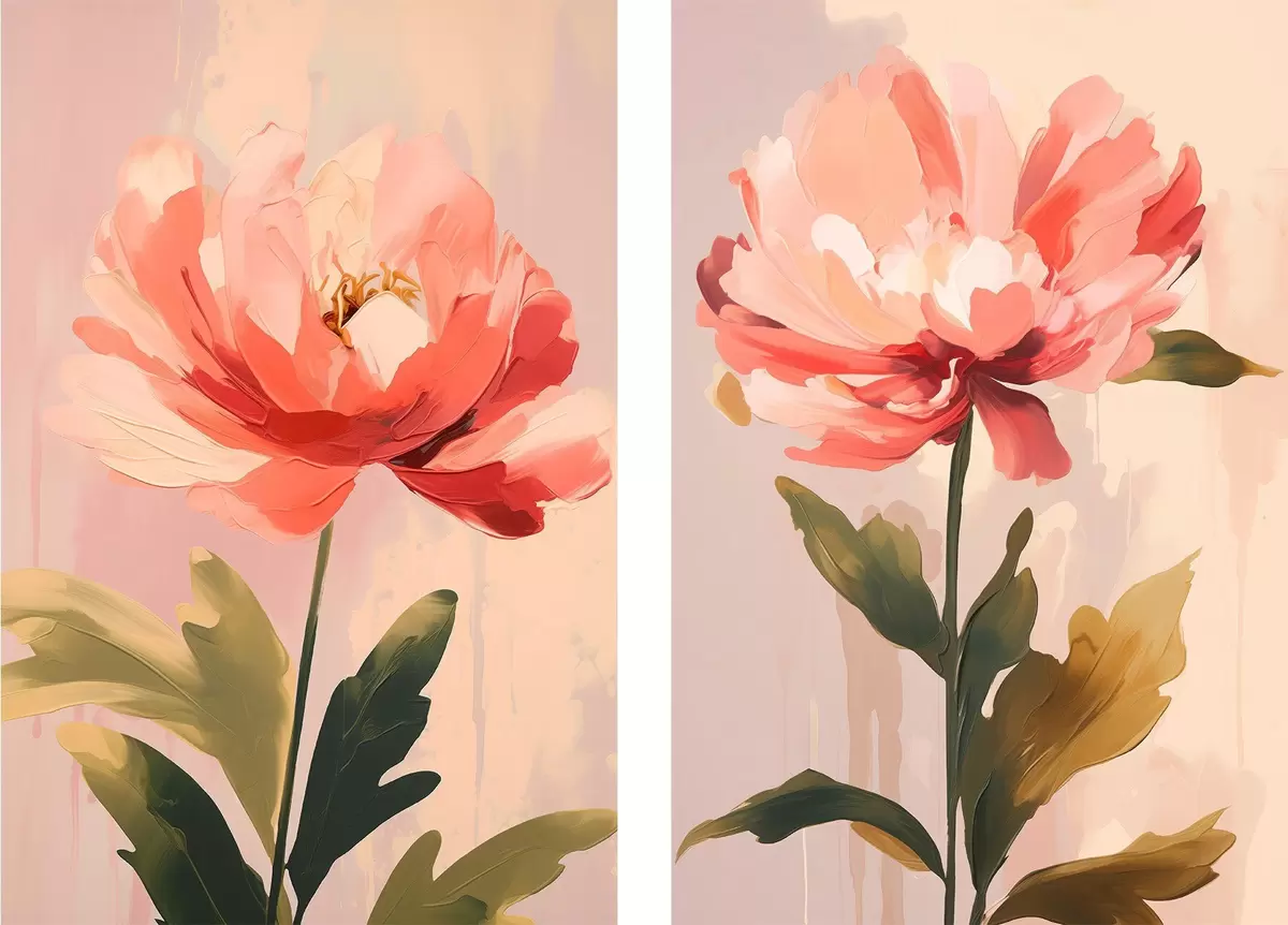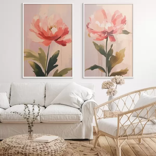 Plakat Pastelltoonides peonid pikkadel varretel soojades roosades toonides d01093