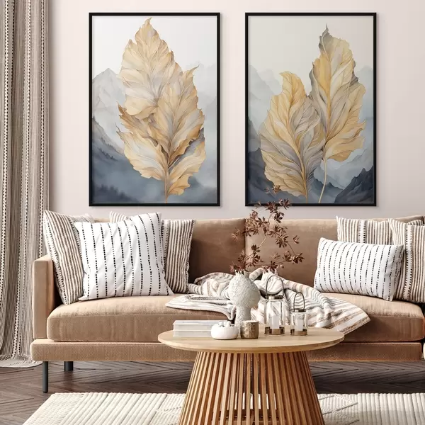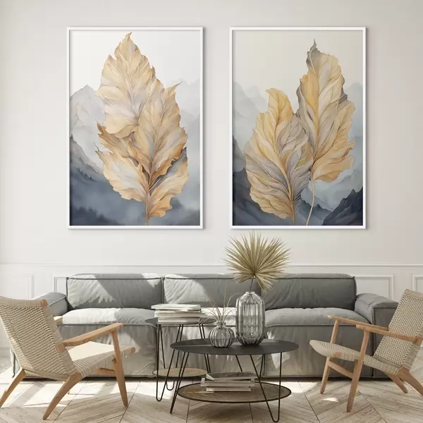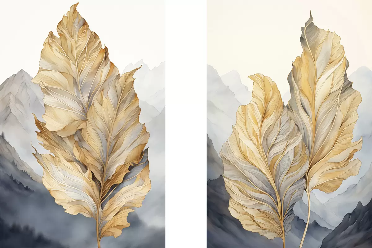 Poster Abstraktsed suured, kollased ja pruunid lehed keeruliste detailidega, mäestiku taustal Nr d01119