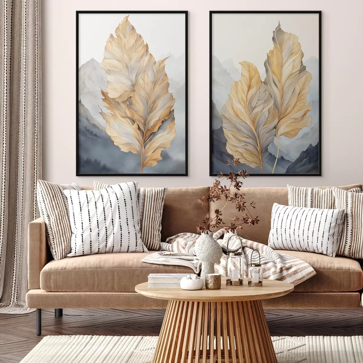 Plakat Abstraktsed suured, kollased ja pruunid lehed keeruliste detailidega, mäestiku taustal d01119