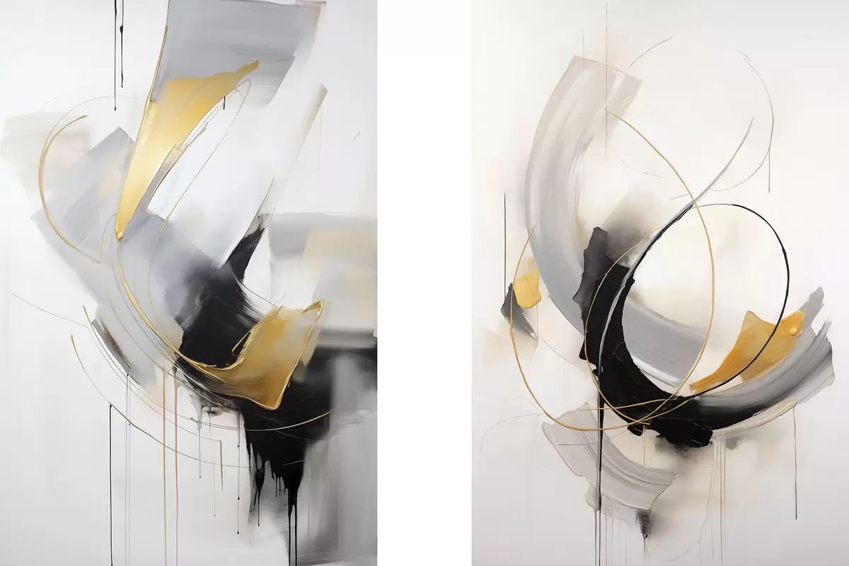 Plakat Abstraktne maal kollaste, mustade ja valgetega pintslitõmmetega, dünaamilised jooned d01125
