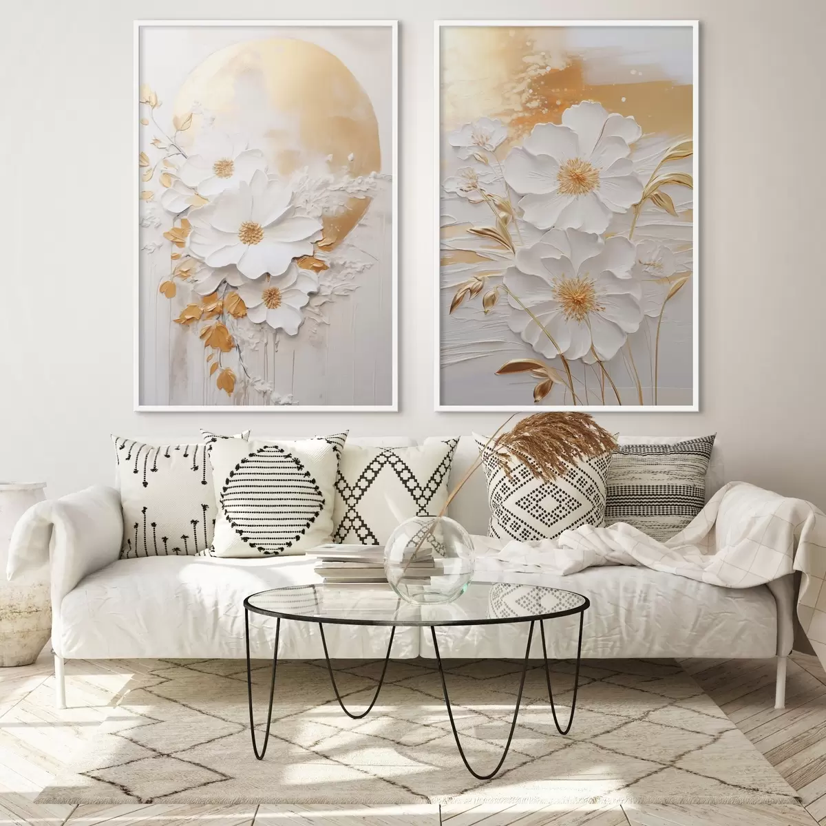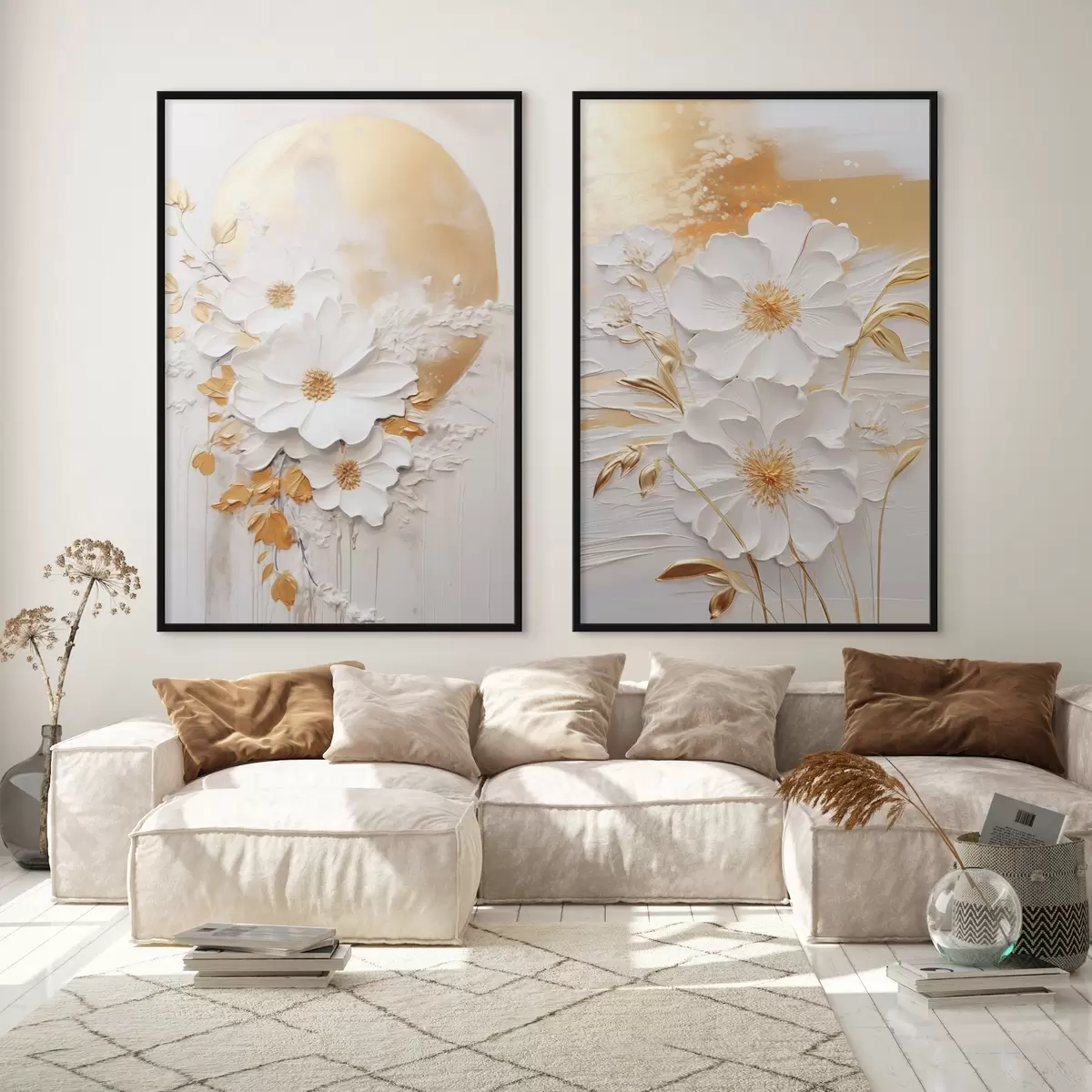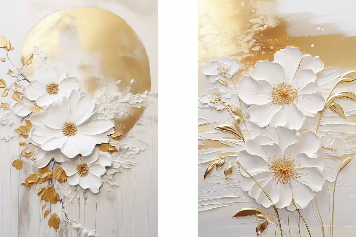 Plakat Valged lilled kollaste aktsentidega ja õrnad lehed tekstuurse taustaga, modernne kunst d01233
