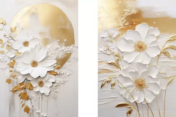 Poster Valged lilled kollaste aktsentidega ja õrnad lehed tekstuurse taustaga, modernne kunst Nr d01233