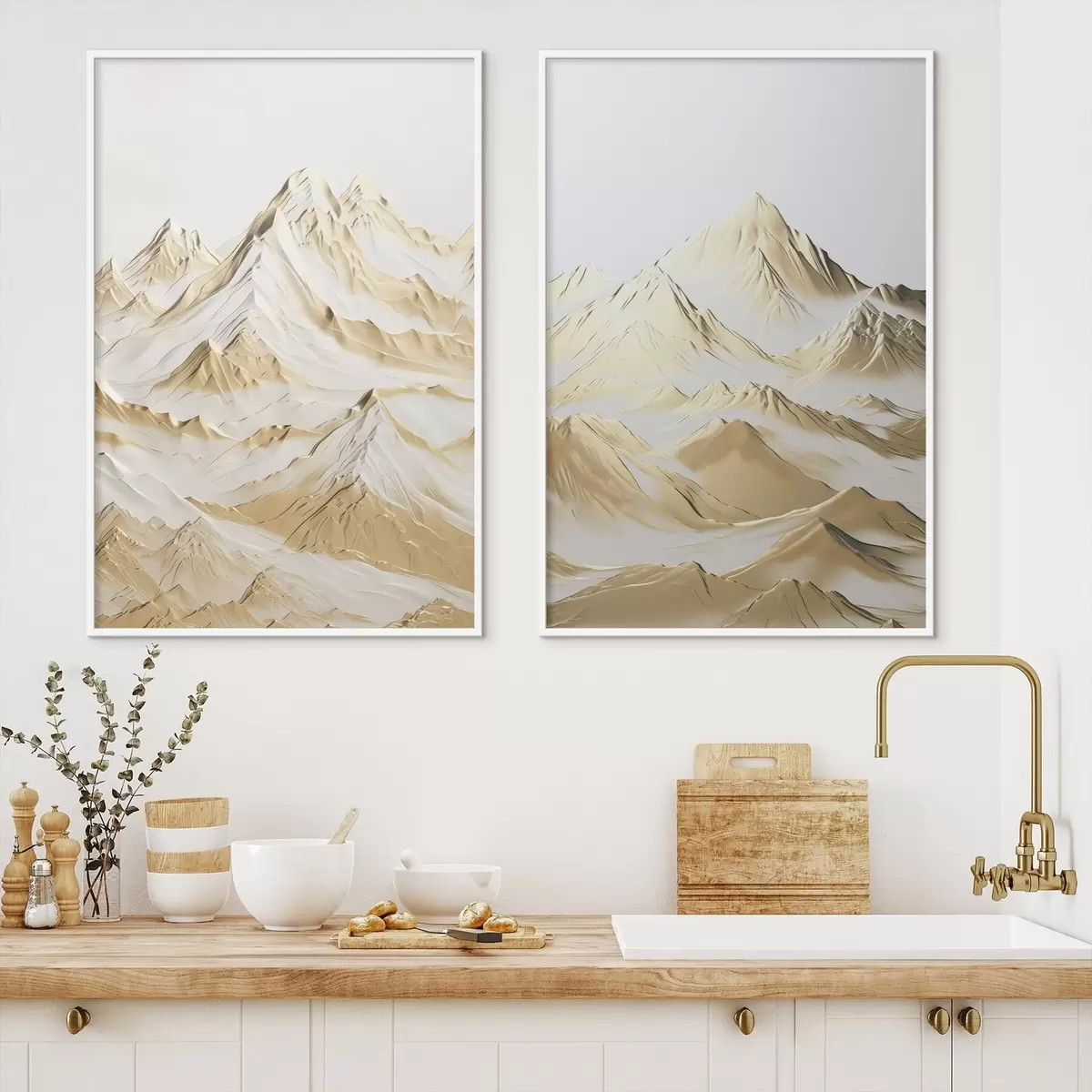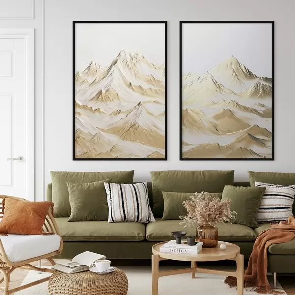 Poster Kollane maastik, lumiste mäetippude ja sügavate orgudega heleda taeva all Nr d01236