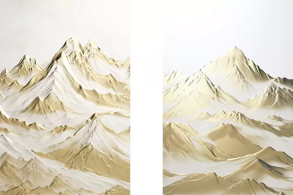 Poster Kollane maastik, lumiste mäetippude ja sügavate orgudega heleda taeva all Nr d01236