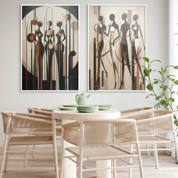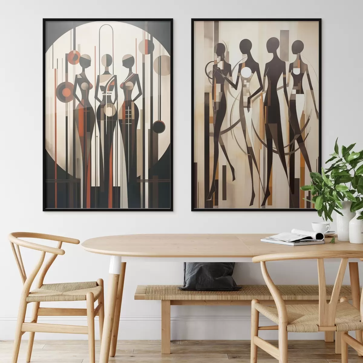 Poster Stiliseeritud naisfiguurid geomeetriliste elementidega abstraktsel vertikaalsete joonte ja ringide taustal Nr d01237
