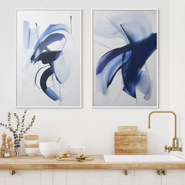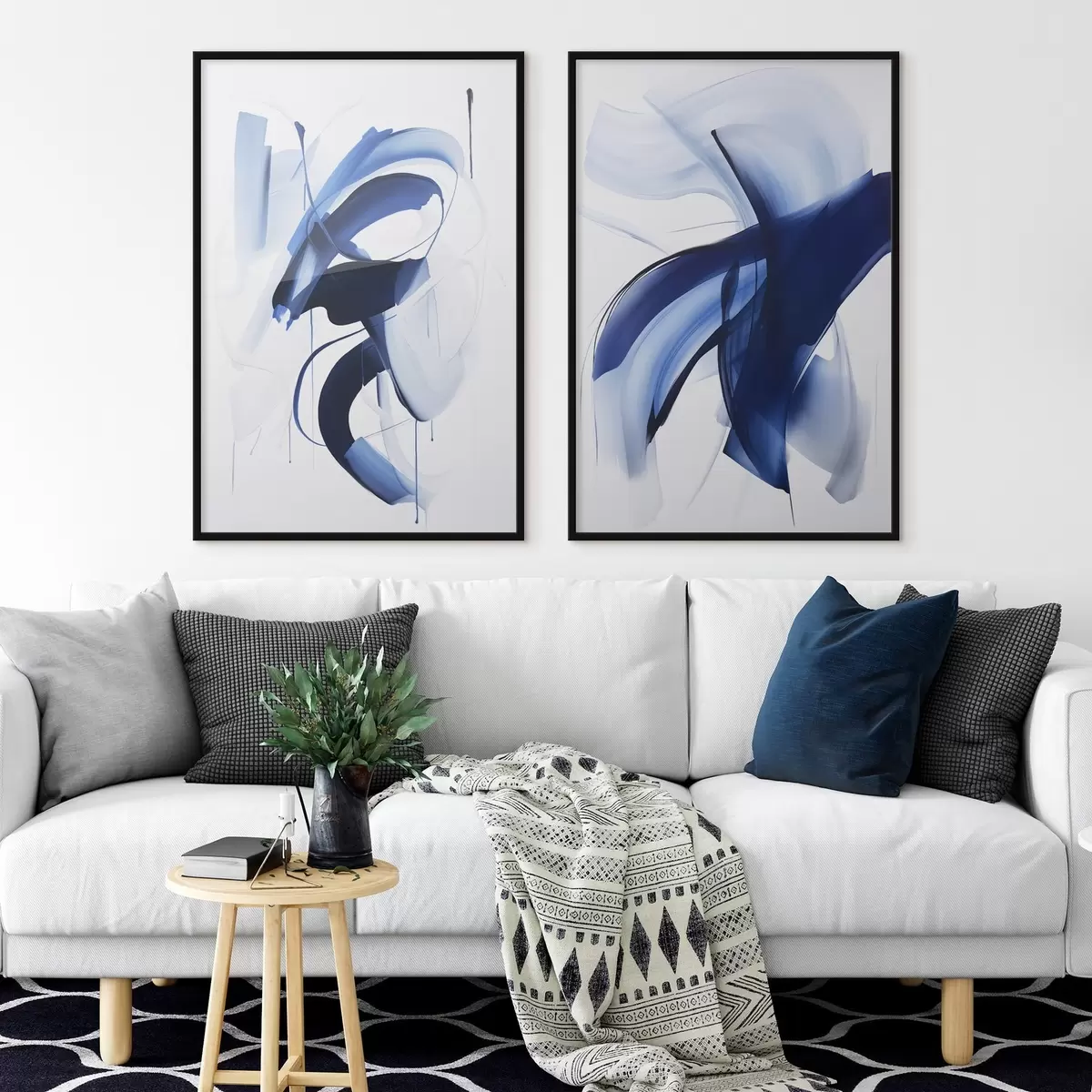 Plakat Abstraktsed sinised pintslitõmbe-taolised kujundid voolavate joonte ja kõverustega valgel taustal, modernne kunst d01240