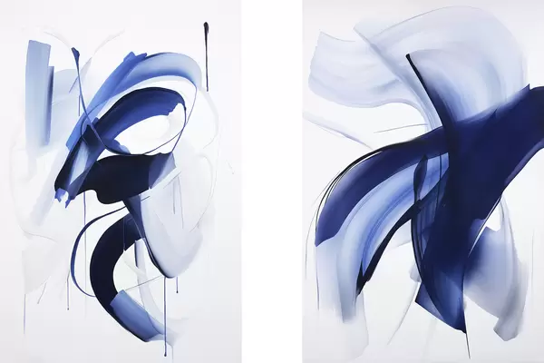 Plakat Abstraktsed sinised pintslitõmbe-taolised kujundid voolavate joonte ja kõverustega valgel taustal, modernne kunst d01240