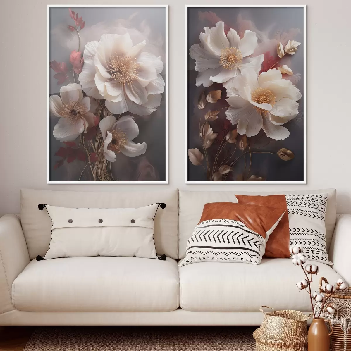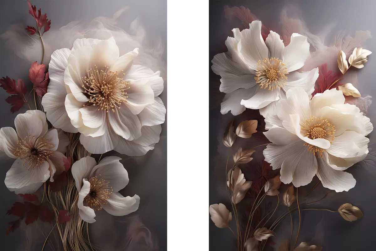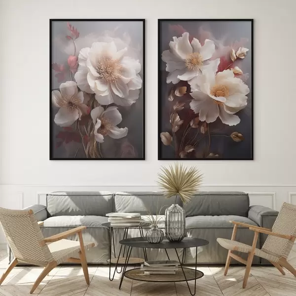 Plakat Õrnad peonid õhukeste, õrnade kroonlehtedega, ümbritsetud tumepunaste ja kollaste lehtedega abstraktsel taustal d01243