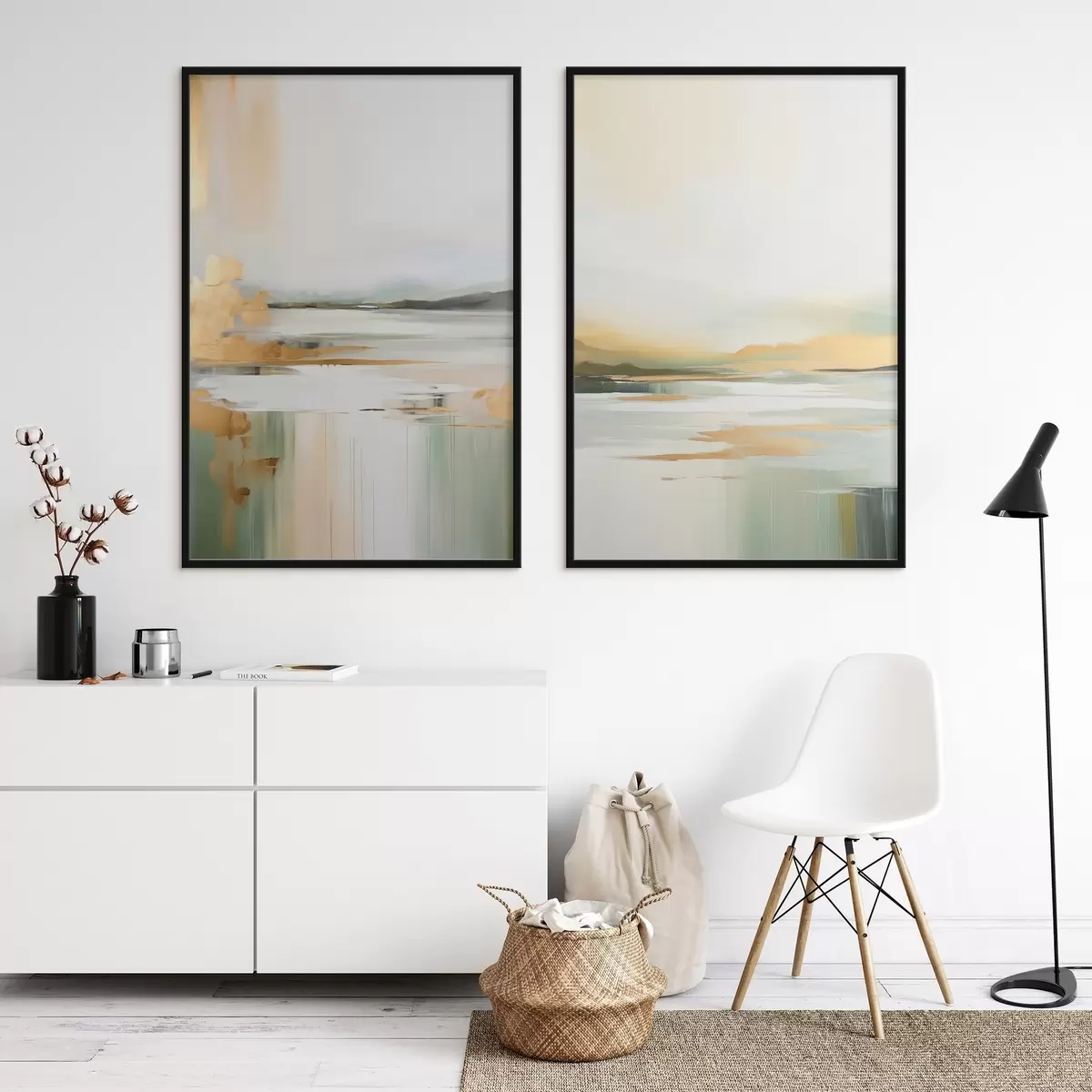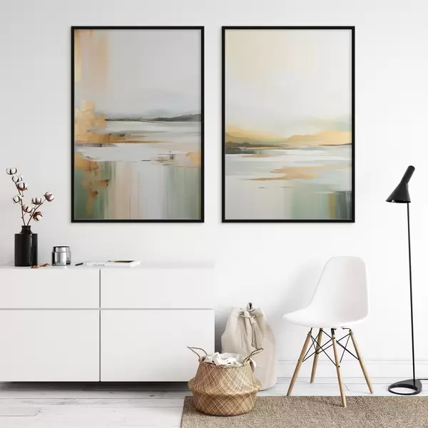 Poster Abstraktne maastik kollaste ja roheliste toonidega, vesi peegeldab taevast ja kauguses asuvaid mägesid, kahvatu, udune taevas Nr d01245