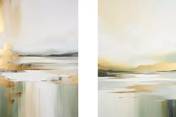 Poster Abstraktne maastik kollaste ja roheliste toonidega, vesi peegeldab taevast ja kauguses asuvaid mägesid, kahvatu, udune taevas Nr d01245