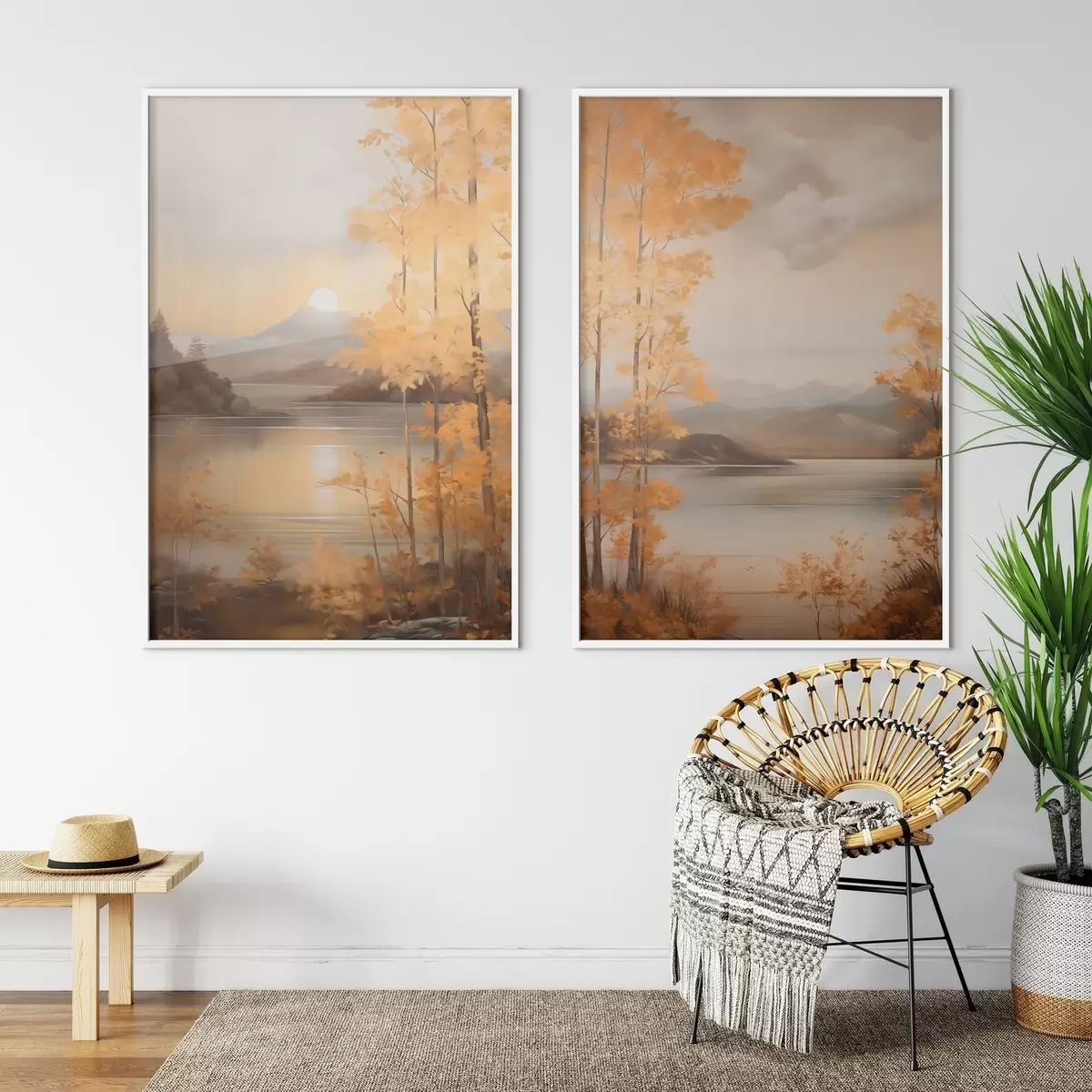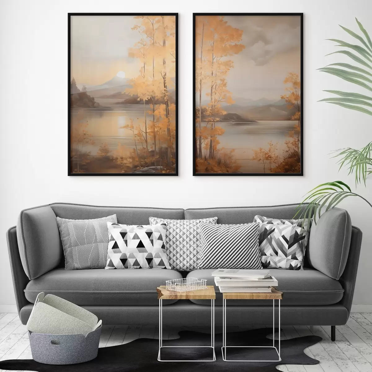 Poster Sügisene tekstuuriga puud oranžide lehtedega raamivad rahulikku järve kauguses asuvate mägedega pilvise taeva all. Nr d01246