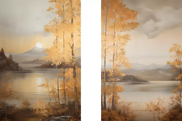 Poster Sügisene tekstuuriga puud oranžide lehtedega raamivad rahulikku järve kauguses asuvate mägedega pilvise taeva all. Nr d01246