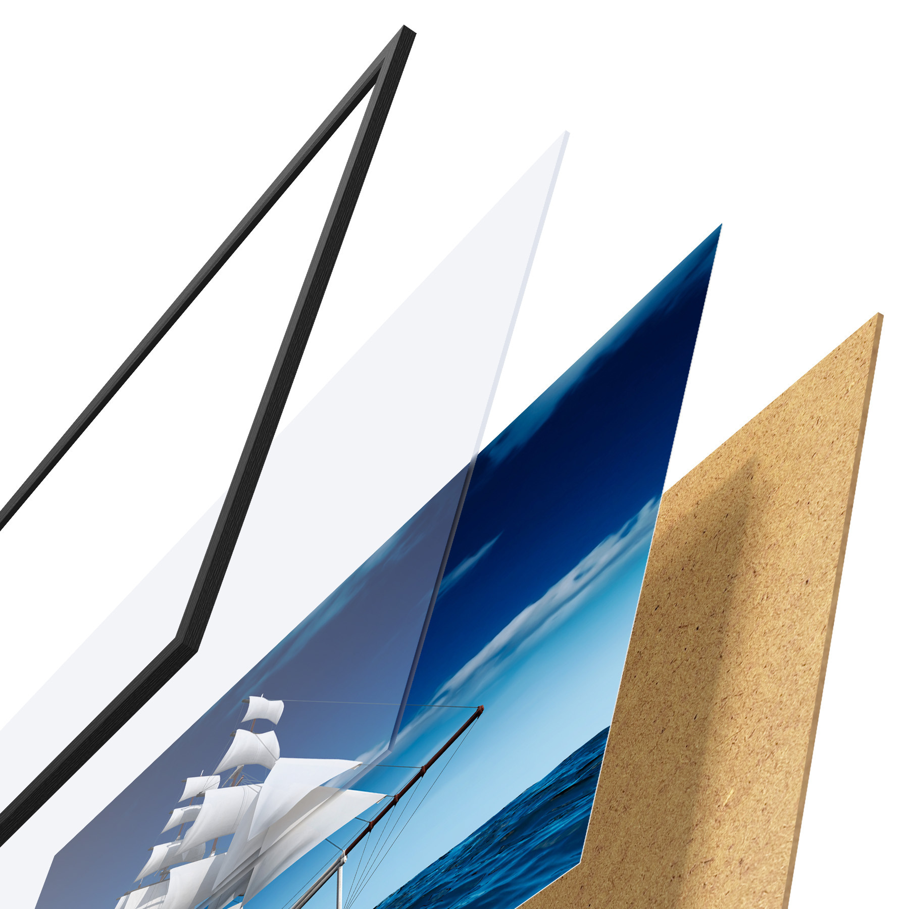 Plakat koosneb raamist, pleksiklaasist, trükitud pildist ja puitlaastplaadist alusplaadist. Tänu tagaküljel olevatele kinnitustele saab plakati kohe seinale riputada.