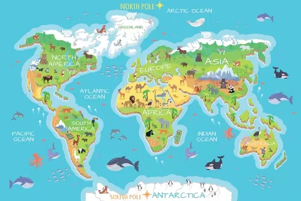 Plakat Kontinentide kaart koos loomadega f32105
