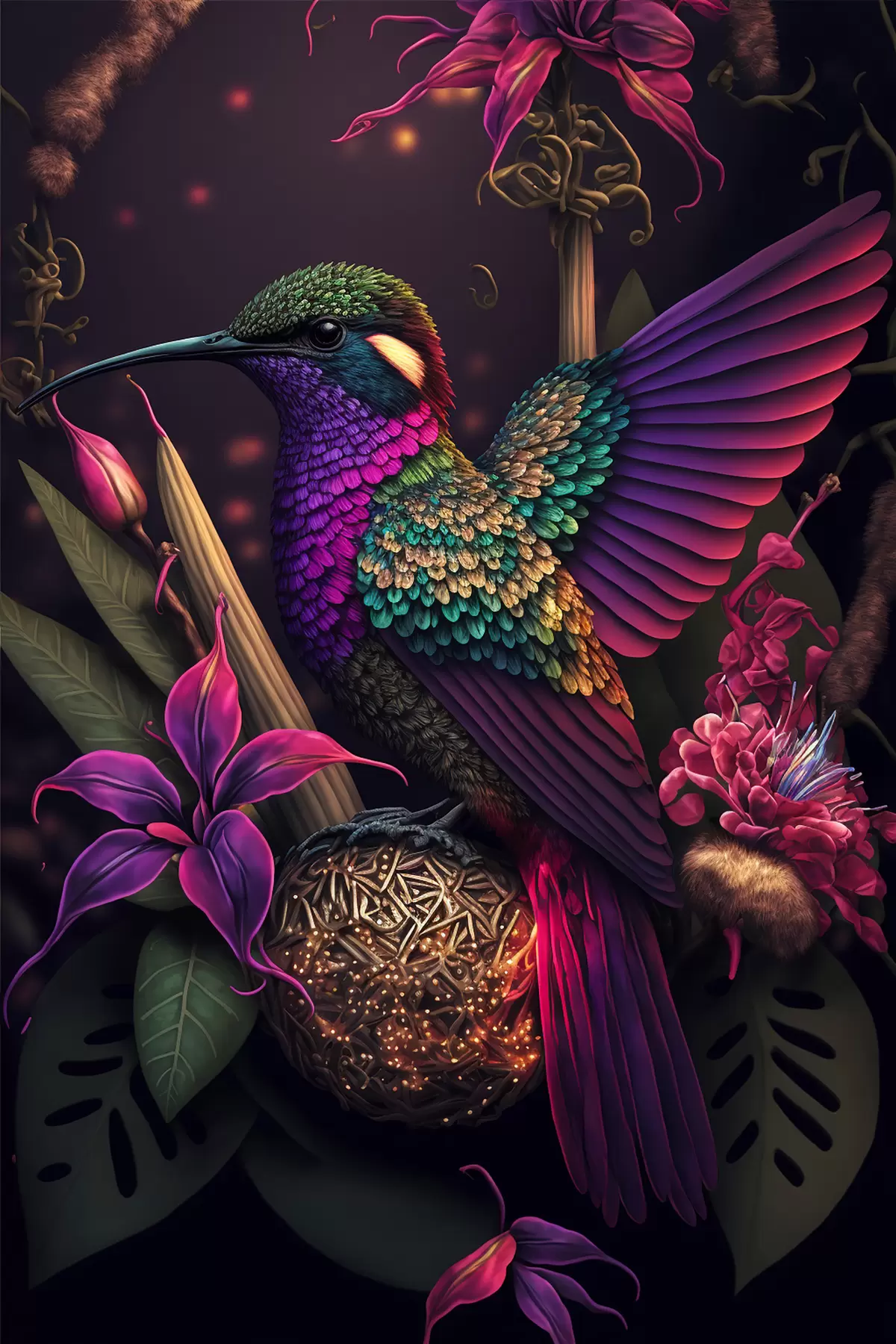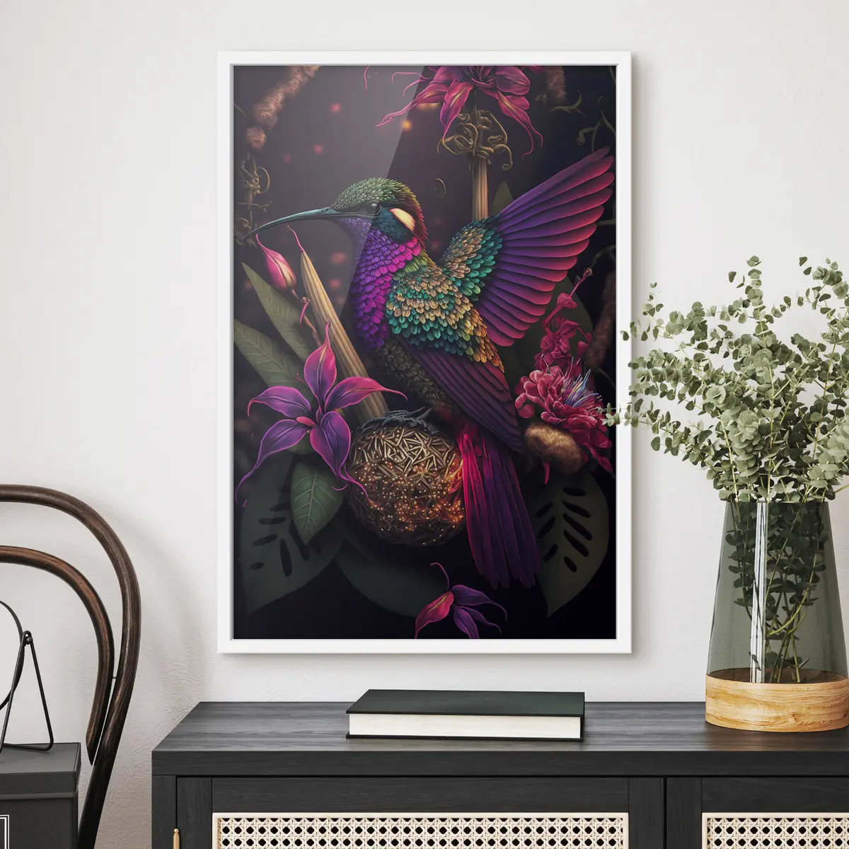 Poster Elav kolibri õitsvate lillede keskel Nr f33703