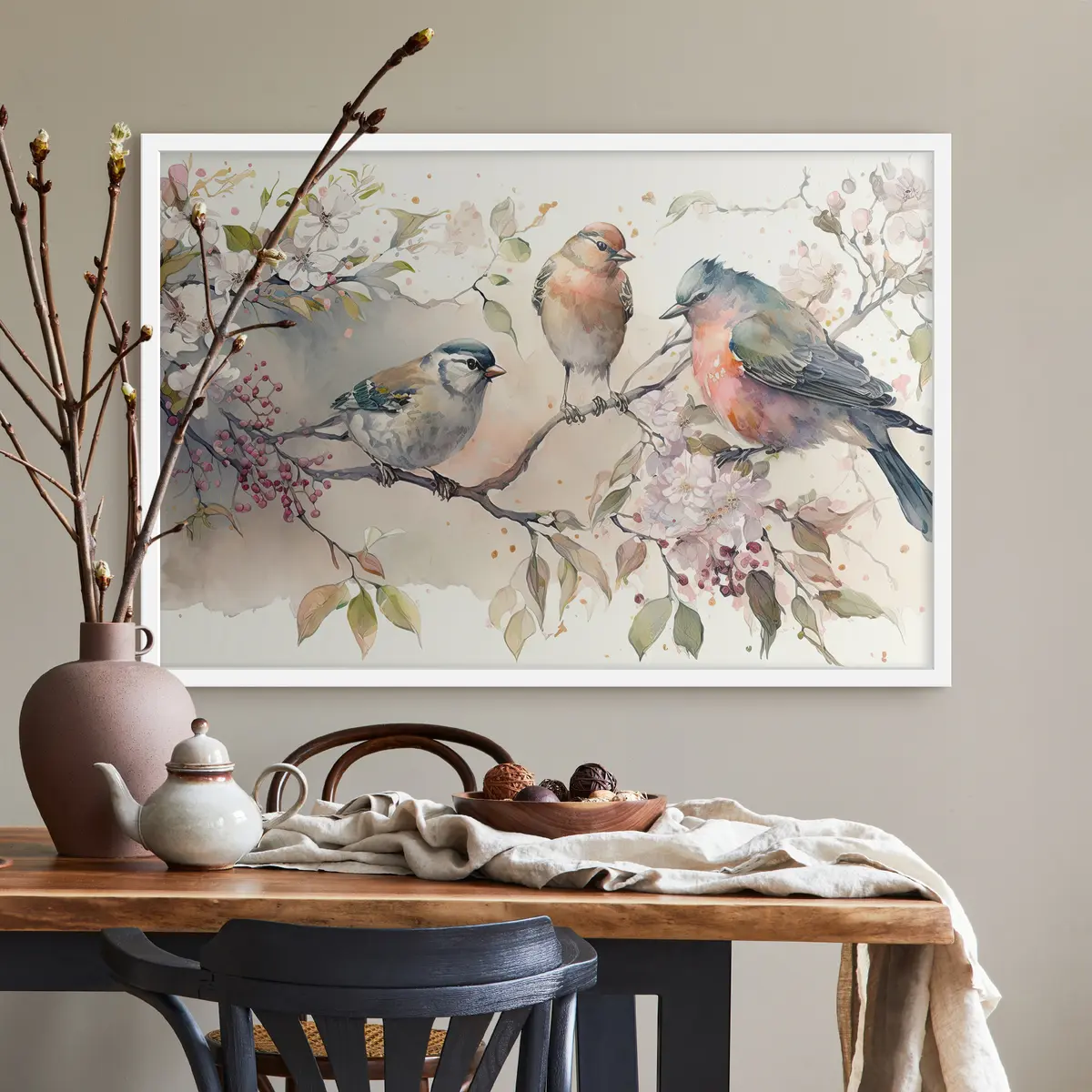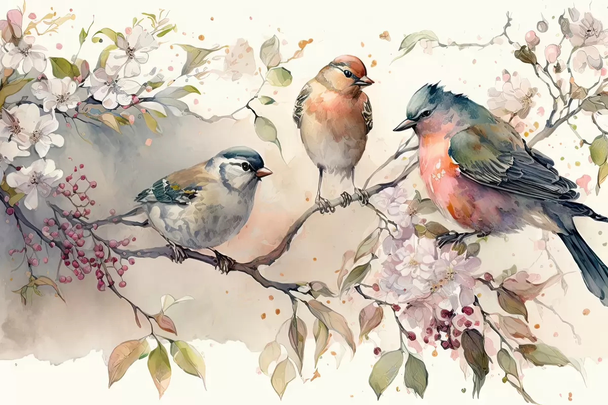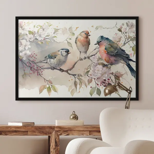 Plakat Värvikad linnud istusid õite keskel f34490