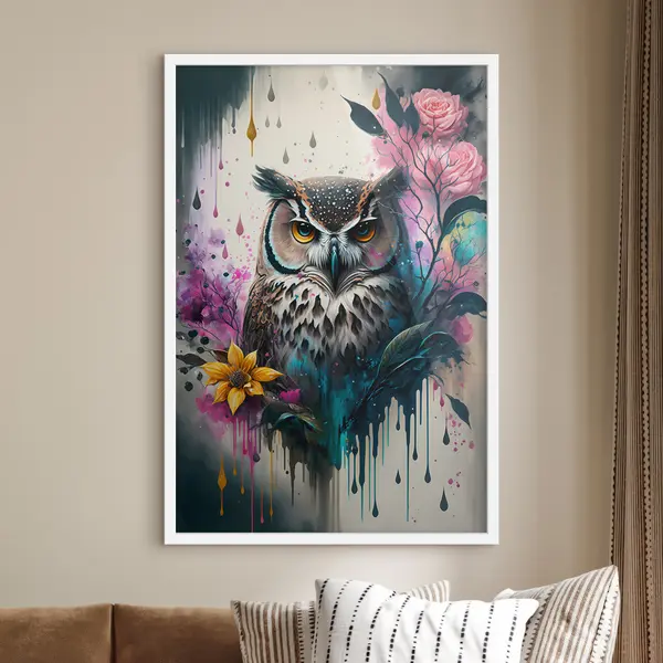 Plakat Öökull, mida ümbritsevad erksad õied f35348