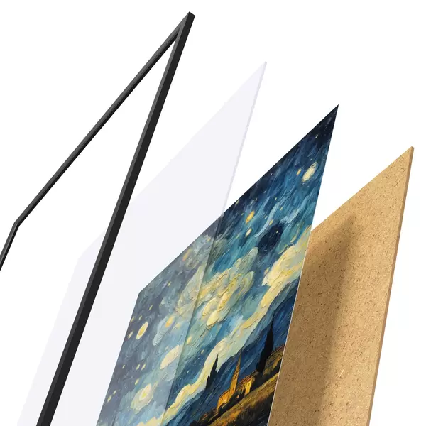 Plakat koosneb raamist, pleksiklaasist, trükitud pildist ja puitlaastplaadist alusplaadist. Tänu tagaküljel olevatele kinnitustele saab plakati kohe seinale riputada.